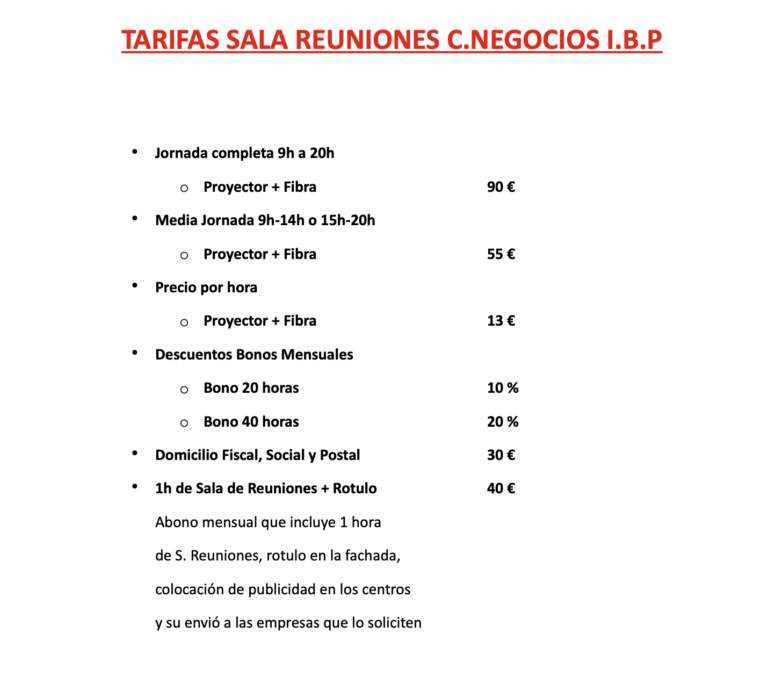 - Además si te domicilias tendrás derecho a una hora de sala de reuniones mensual, y podras ubicar tu publicidad dentro del centro de negocios para que otras empresas o clientes se pongan en contacto contigo y tambien podras usar la cartelería exterior.